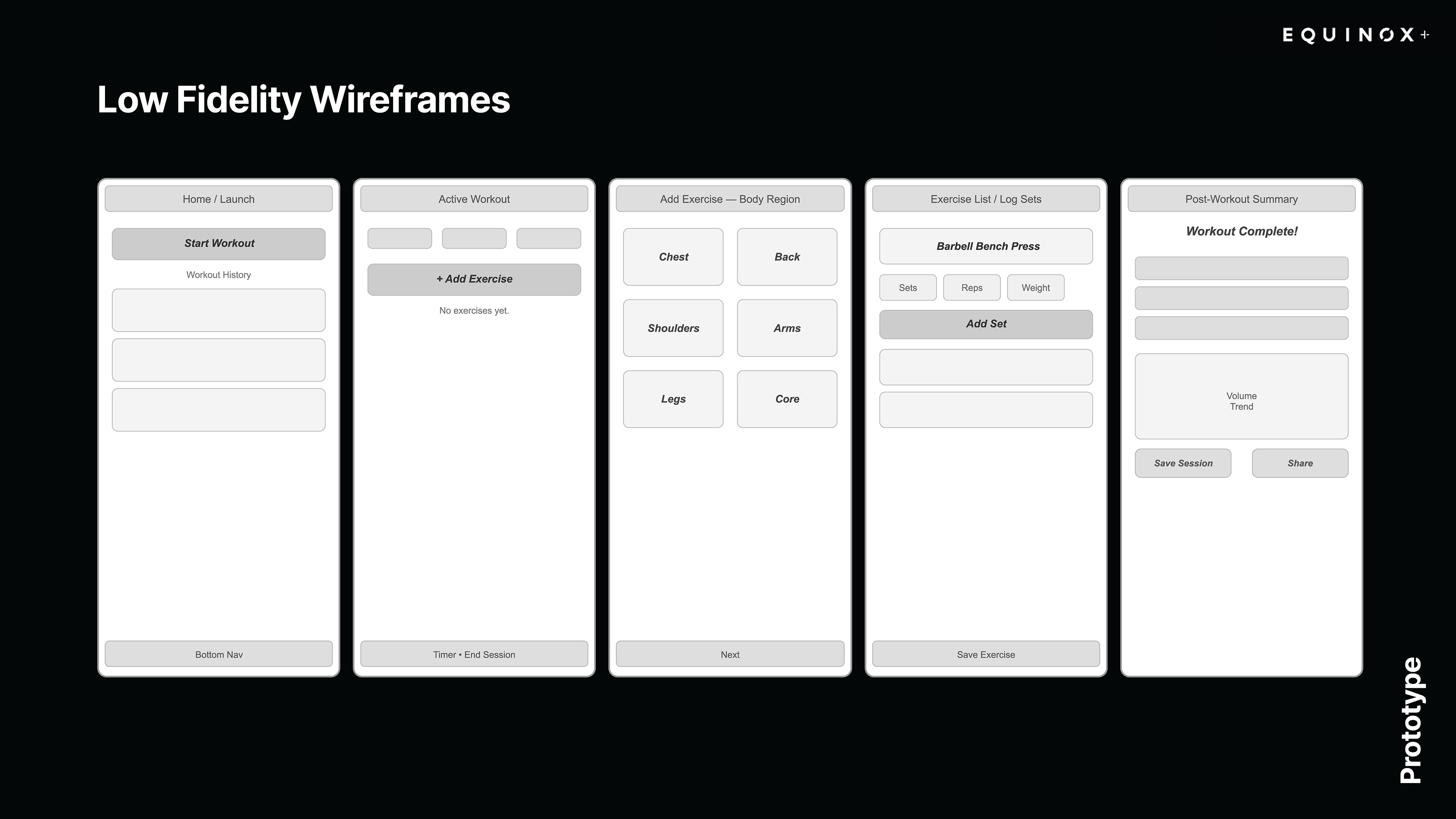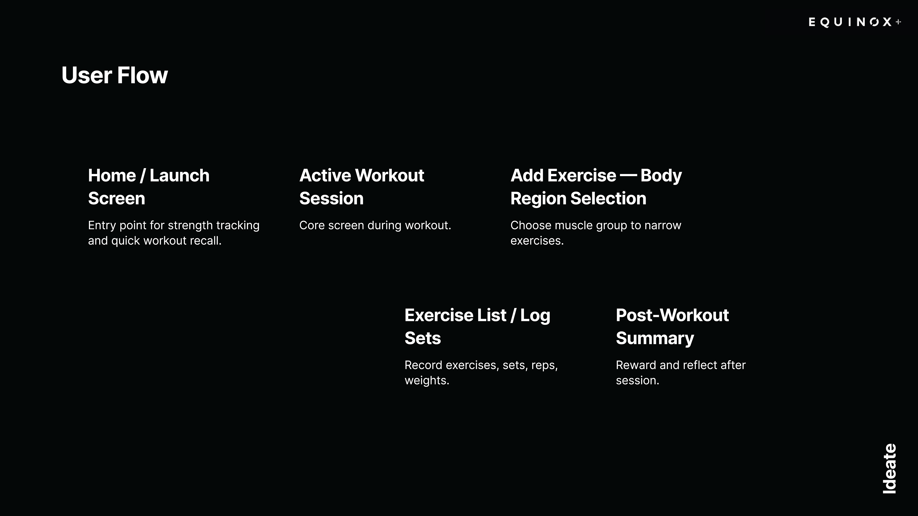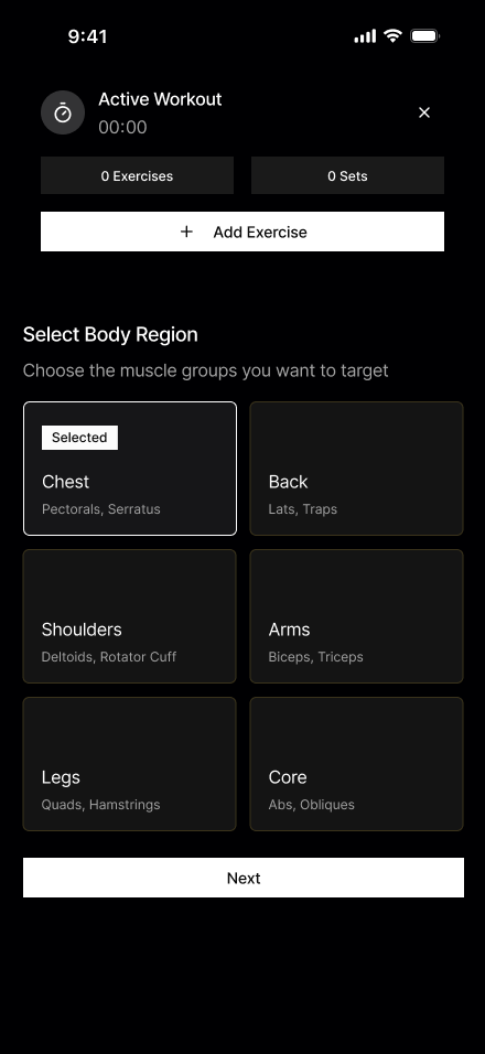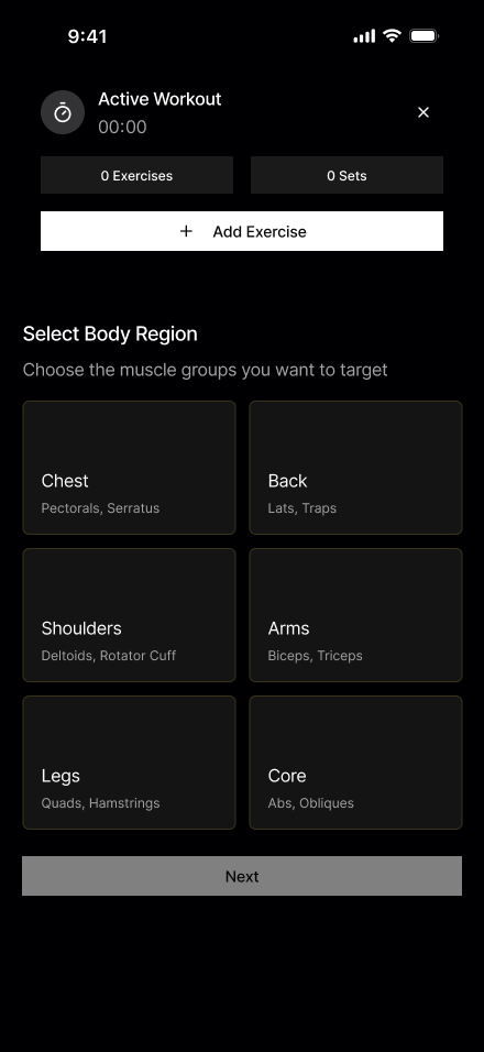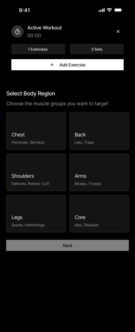 Given the time constraint of this project, I decided to pursue a MVP with minimal interface, guided by muscle group, ease of use, and elegant progress visualization.