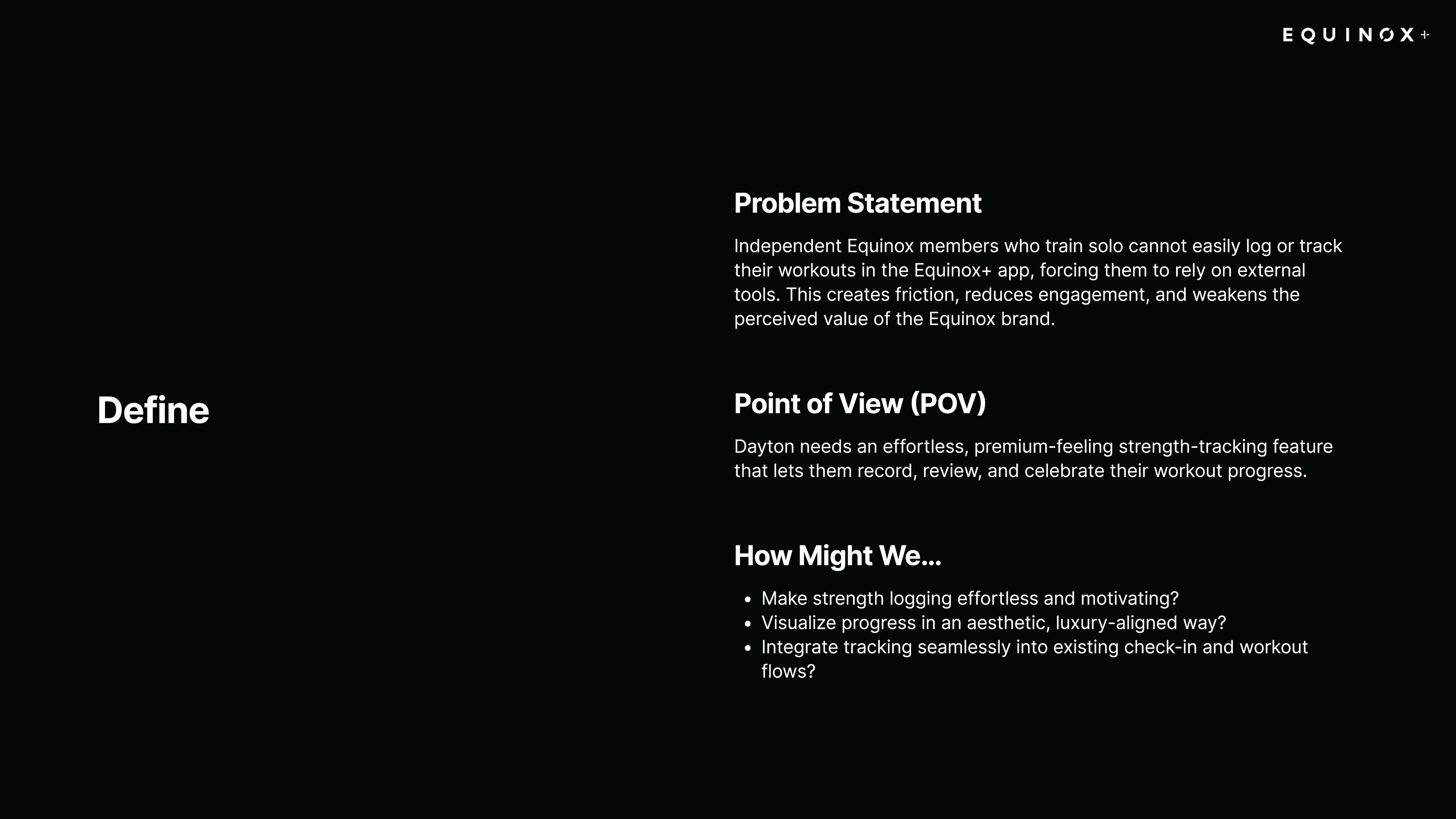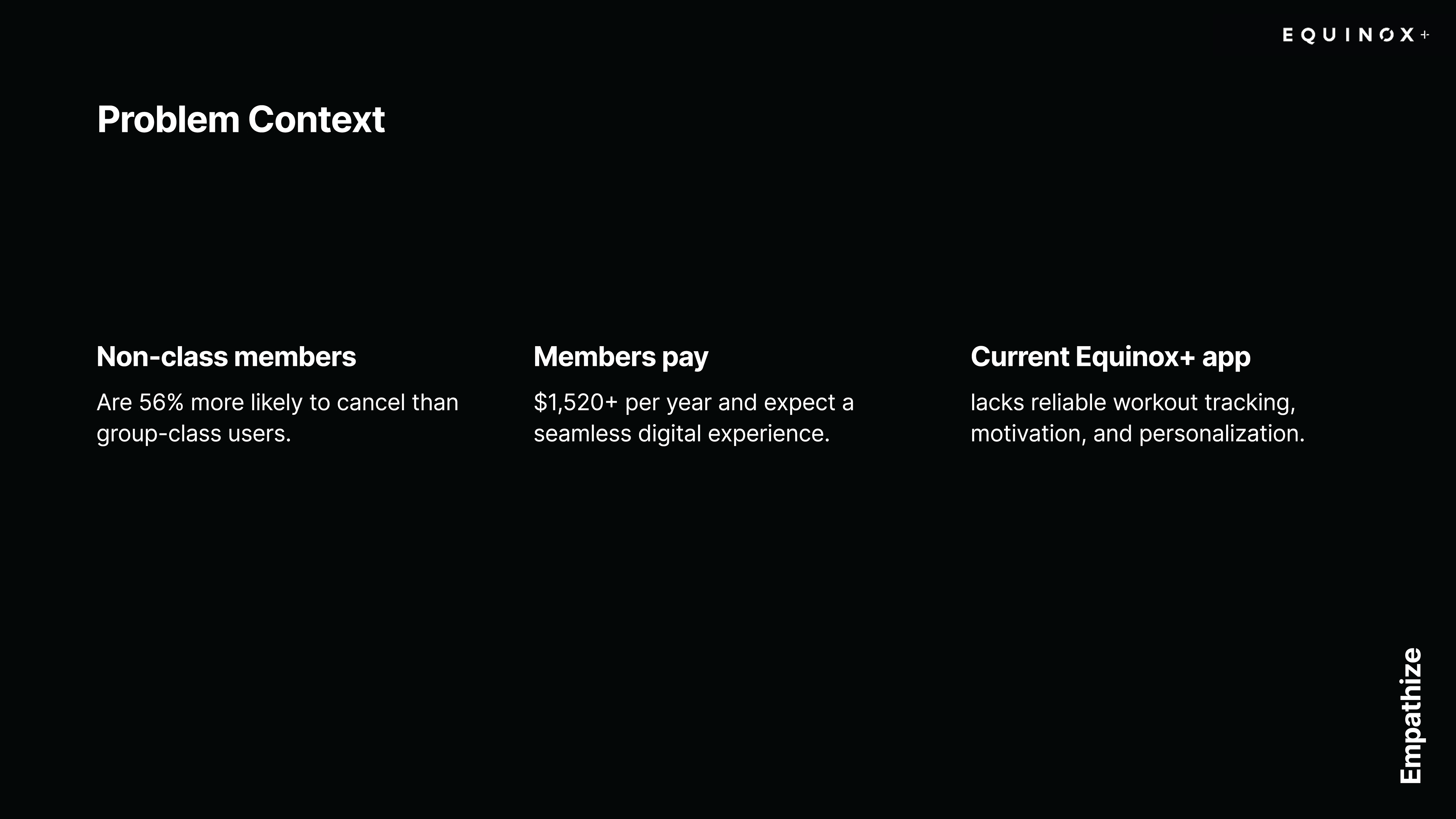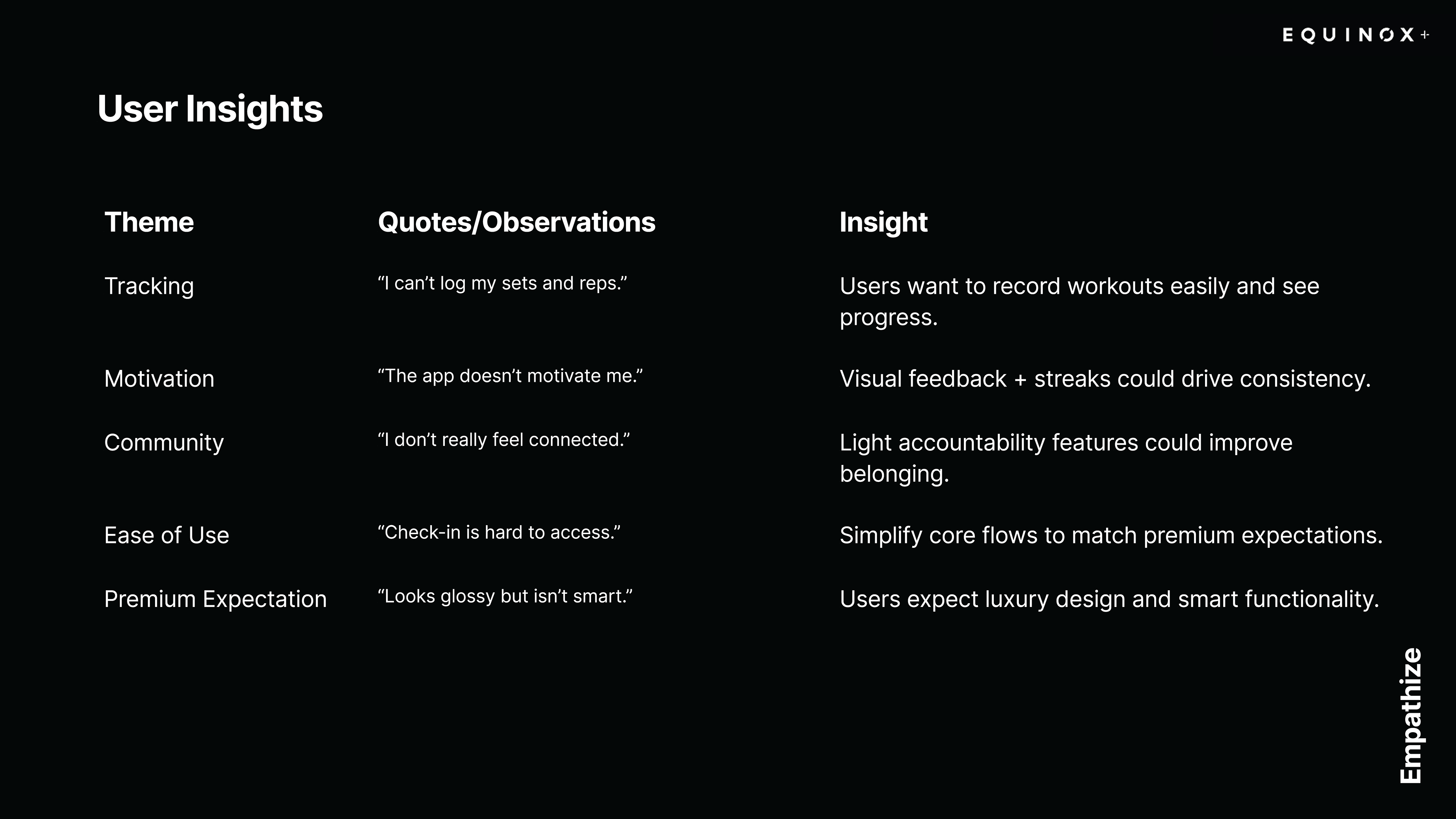 Equinox members pay for a premium in-club experience, but independent (non-class) lifters often feel under-supported by the Equinox+ app. From my secondary research and six member interviews, I found: