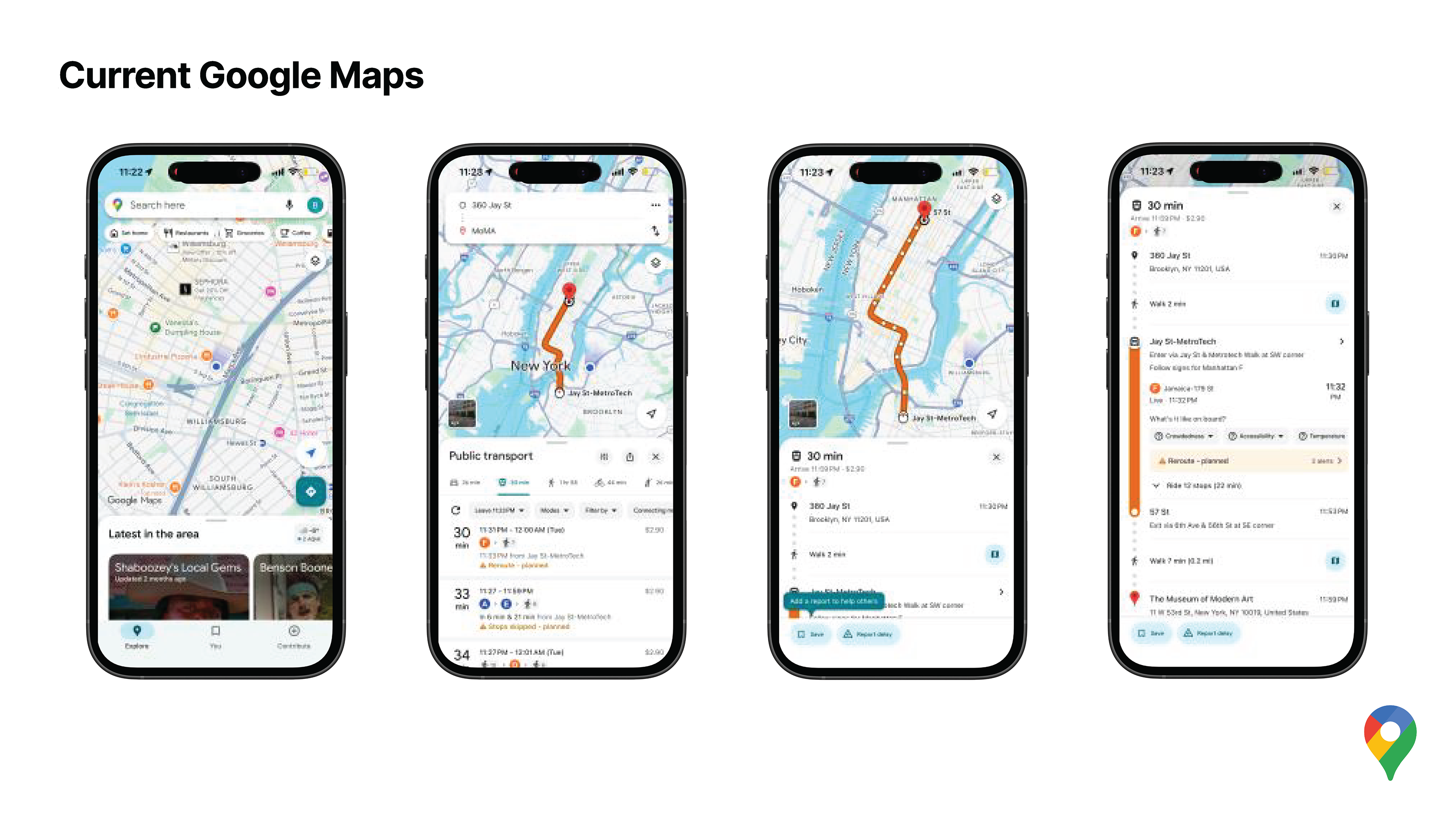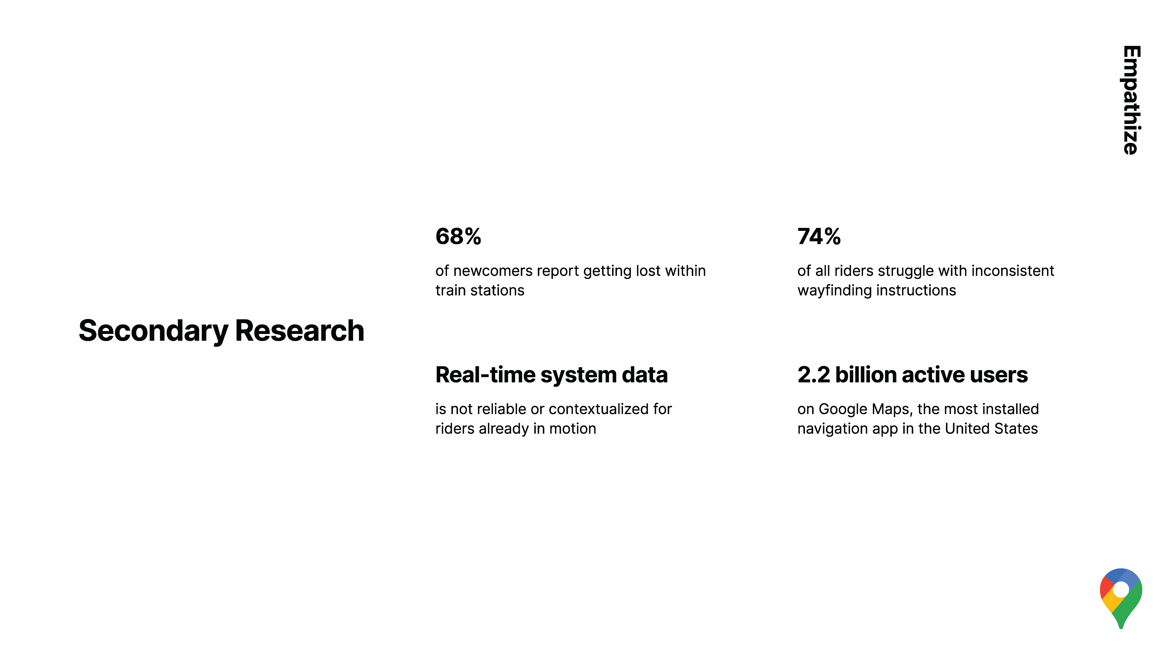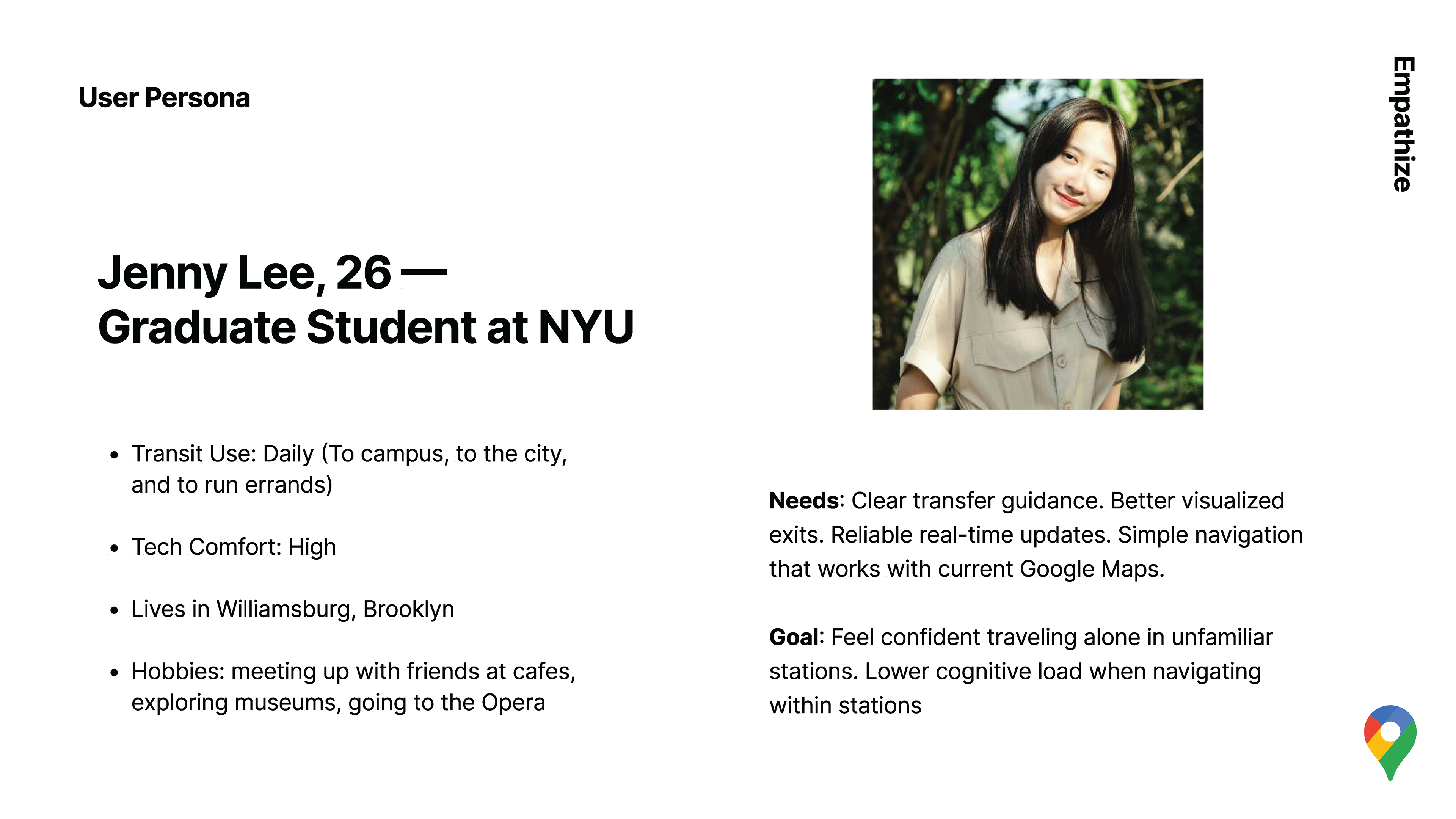 New York City’s subway system is one of the largest and most complex transit networks in the world, serving 3.4 million daily riders across 36 lines and 472 stations. While Google Maps excels at route planning, riders often struggle inside stations—where signage is inconsistent, real-time updates are unclear, and confidence drops during transfers and delays.