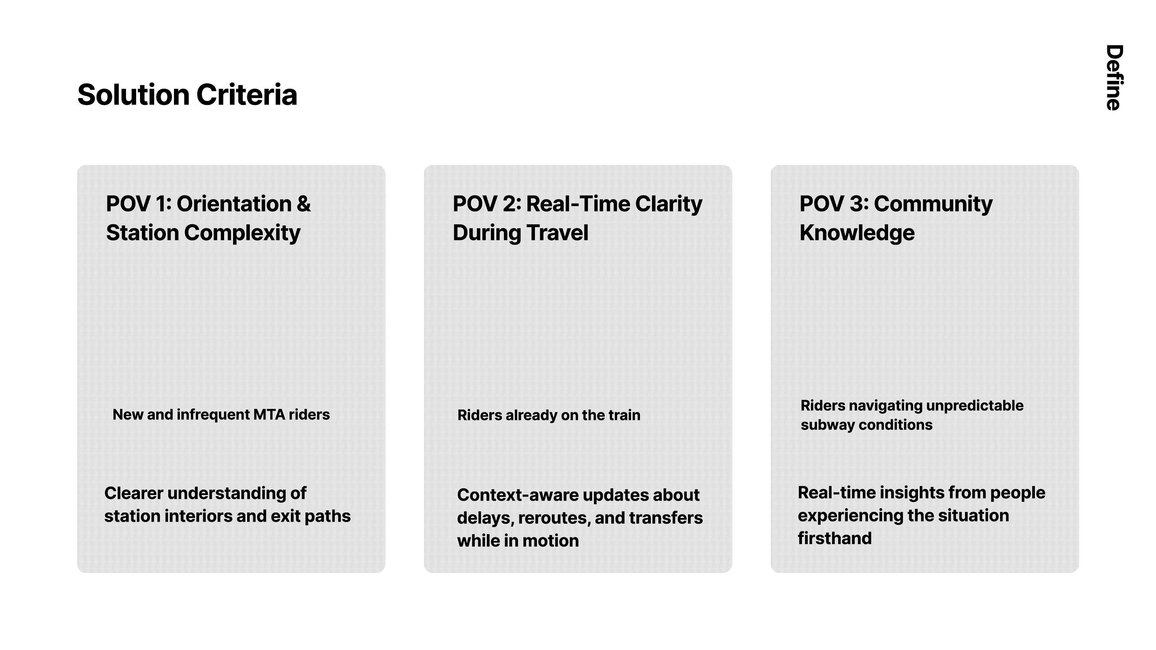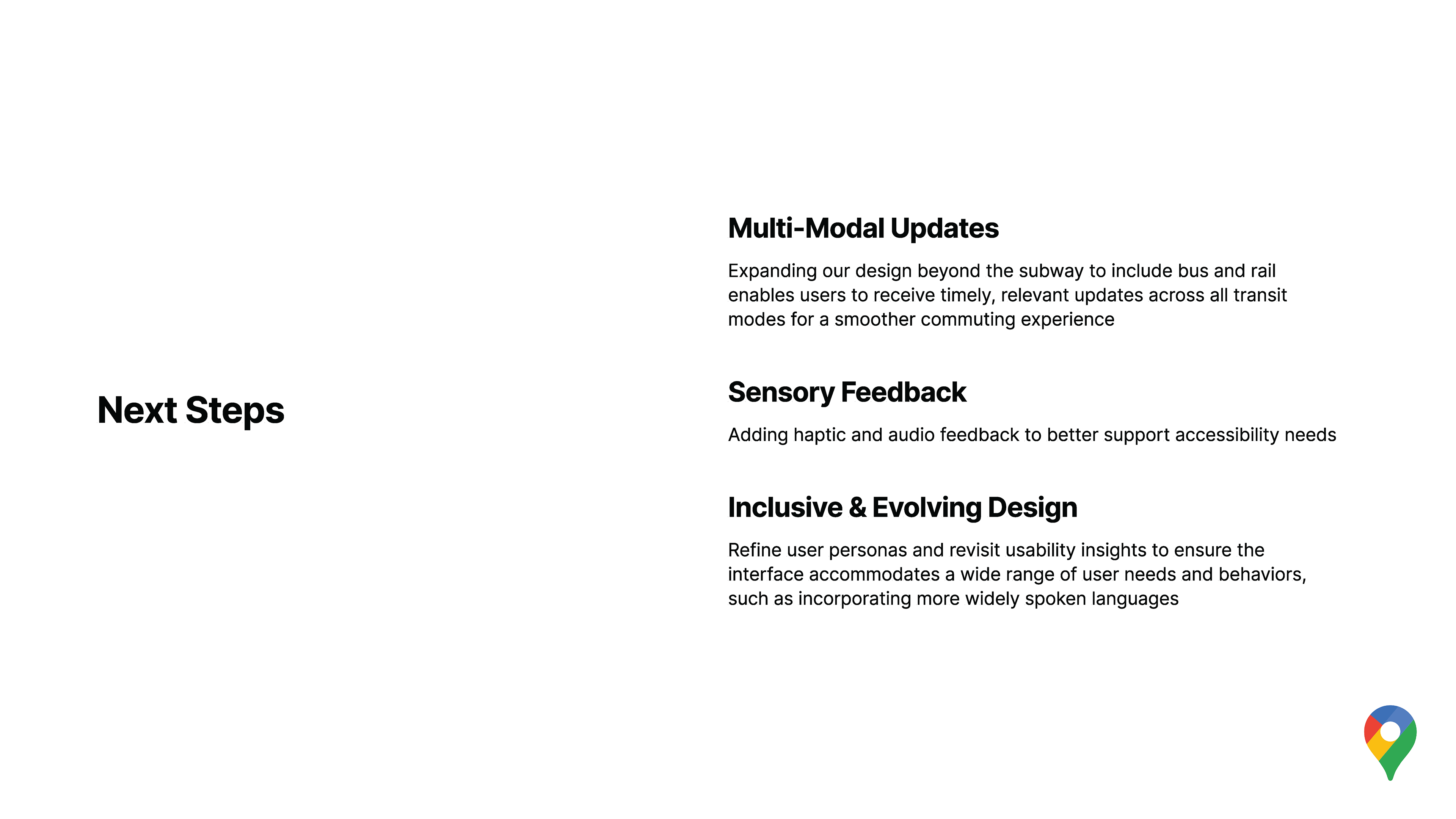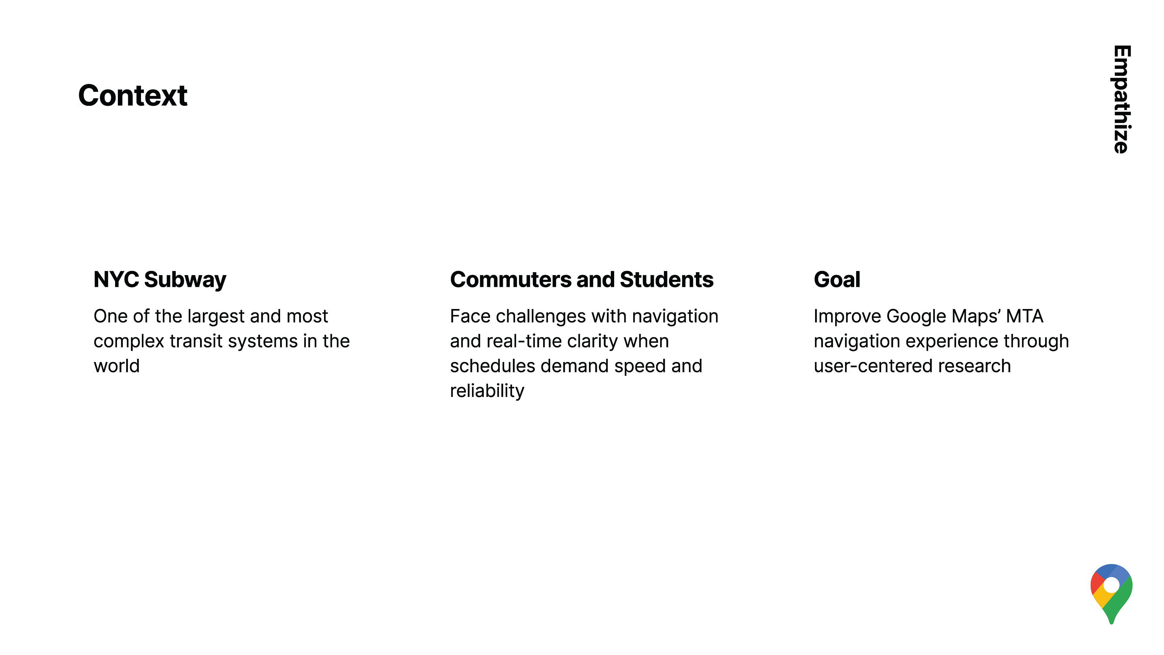 New York City’s subway system is one of the largest and most complex transit networks in the world, serving 3.4 million daily riders across 36 lines and 472 stations. While Google Maps excels at route planning, riders often struggle inside stations—where signage is inconsistent, real-time updates are unclear, and confidence drops during transfers and delays.