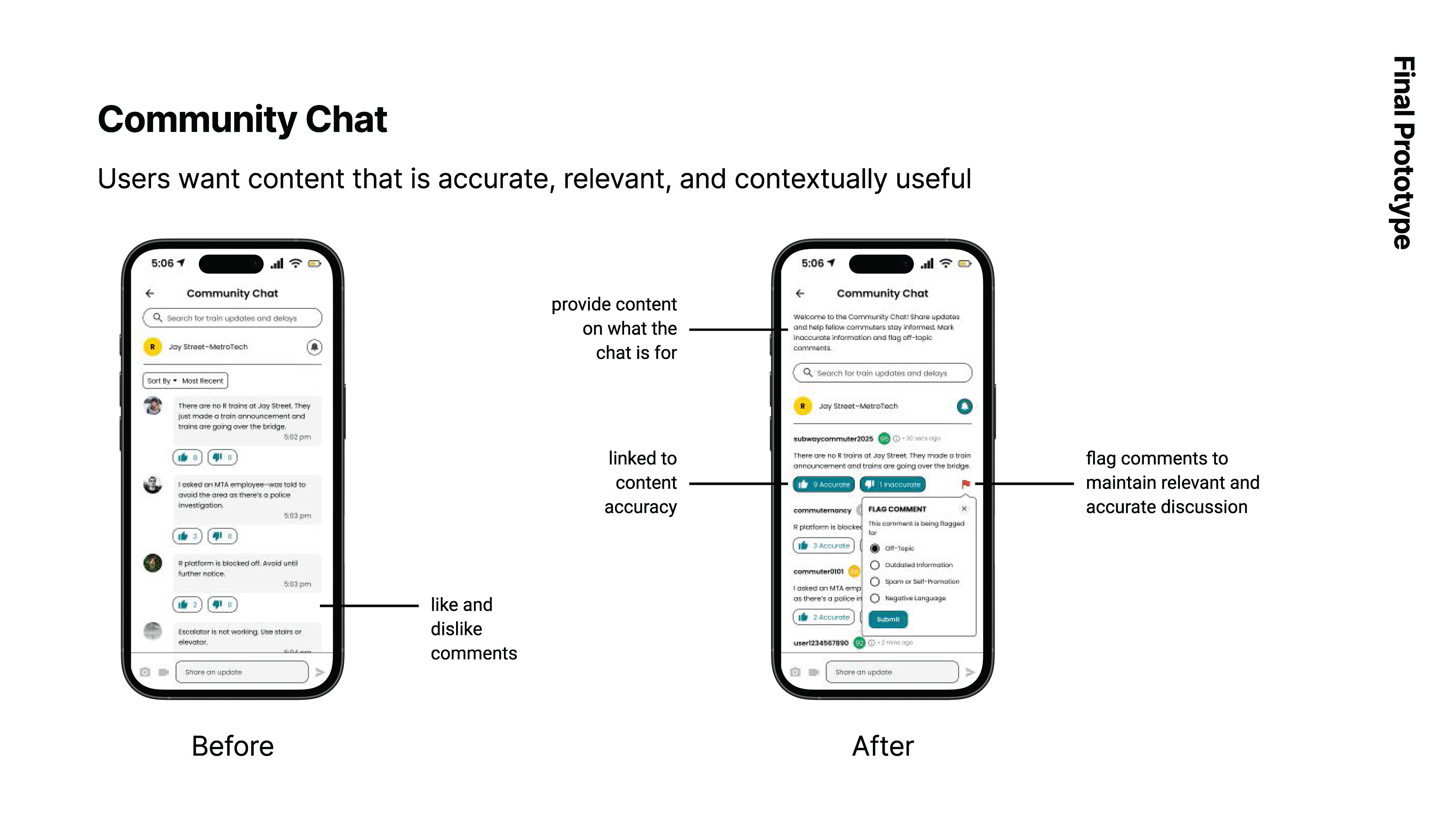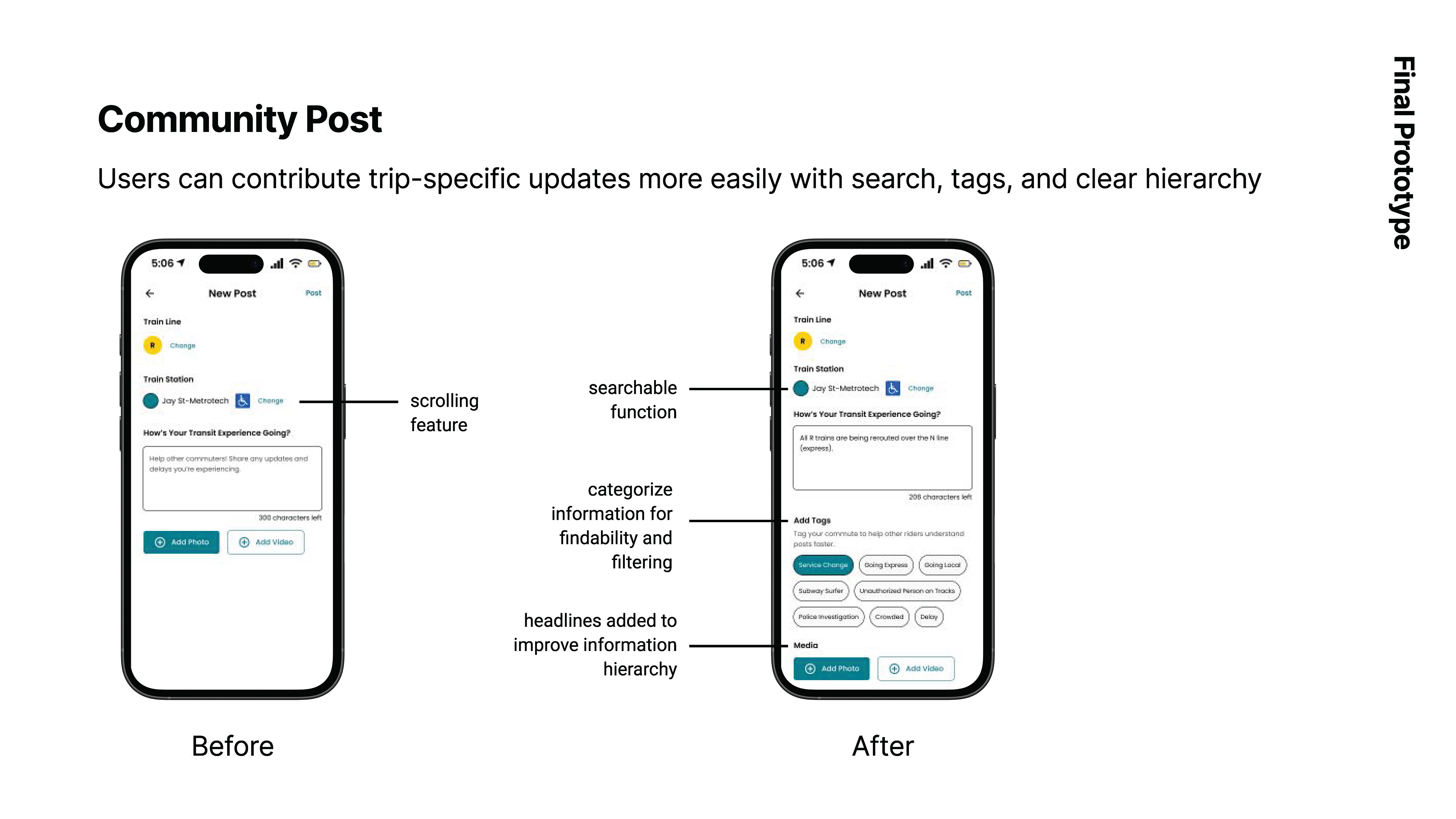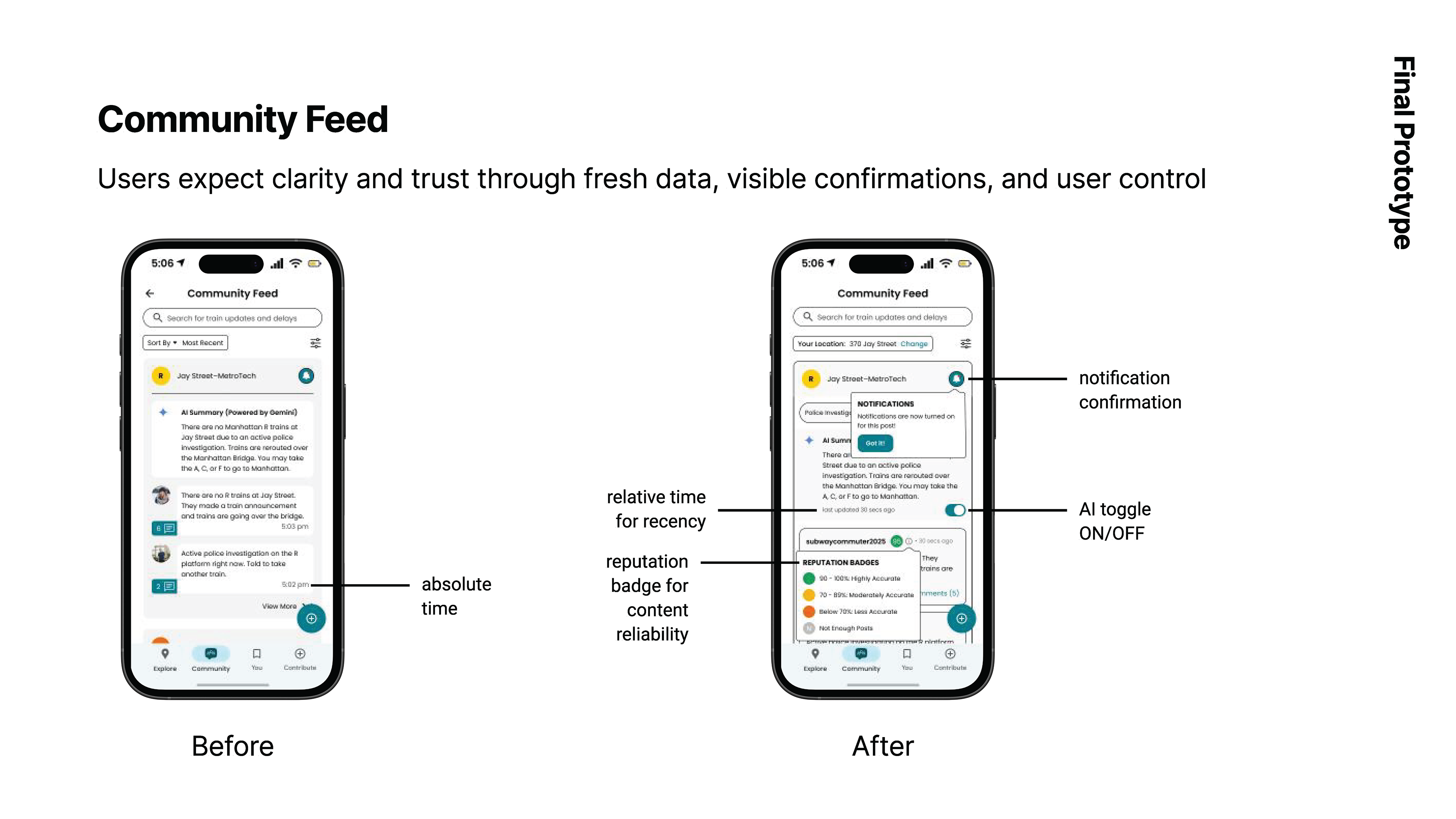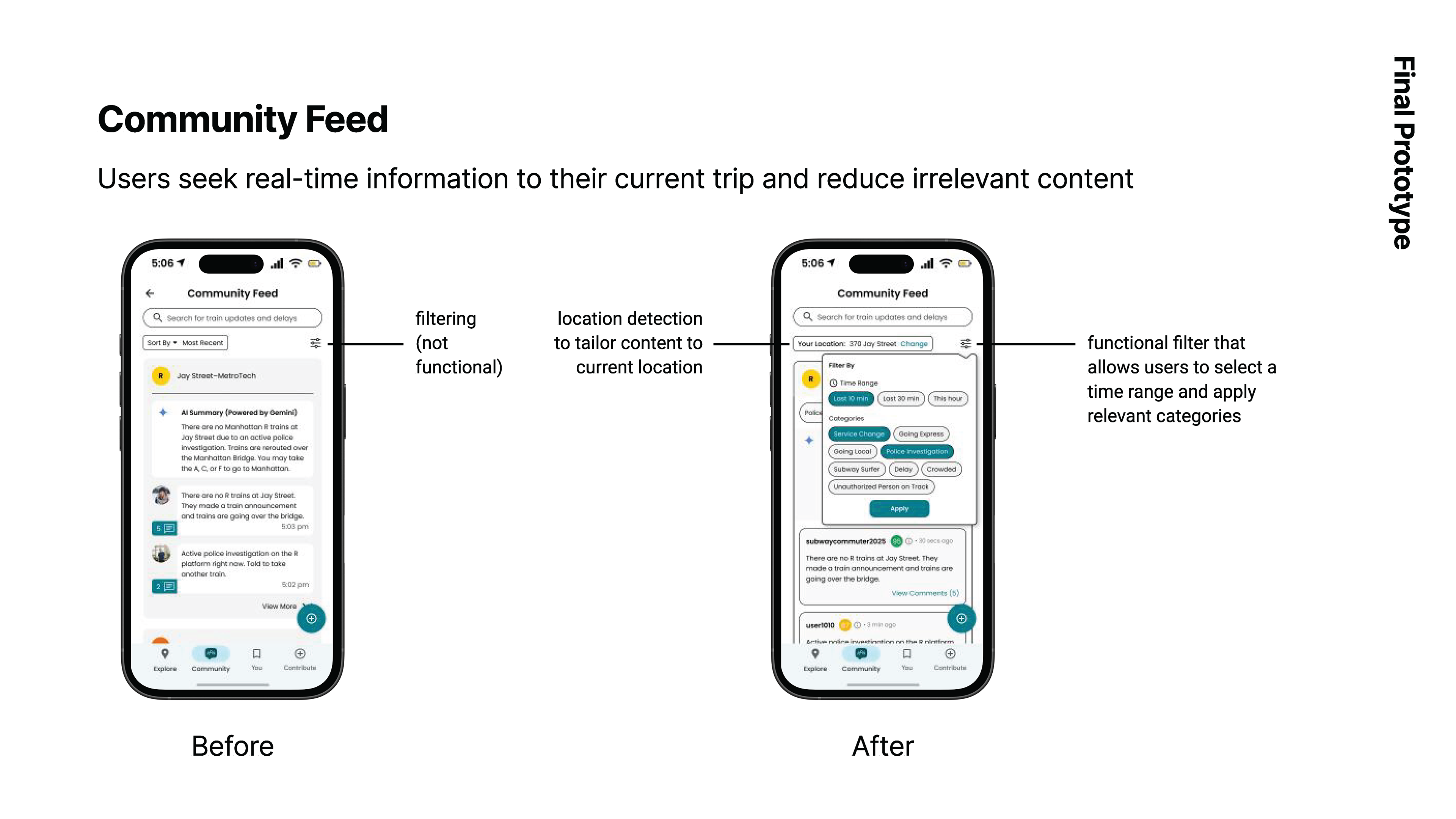 I gained hands-on experience conducting user interviews and usability testing, leading affinity mapping and prioritization, and balancing clarity with complexity when designing for high-stakes, real-world environments like public transit. Designing for riders in motion sharpened my sensitivity to cognitive load, timing, and information relevance—skills that I will carry into future UX work.