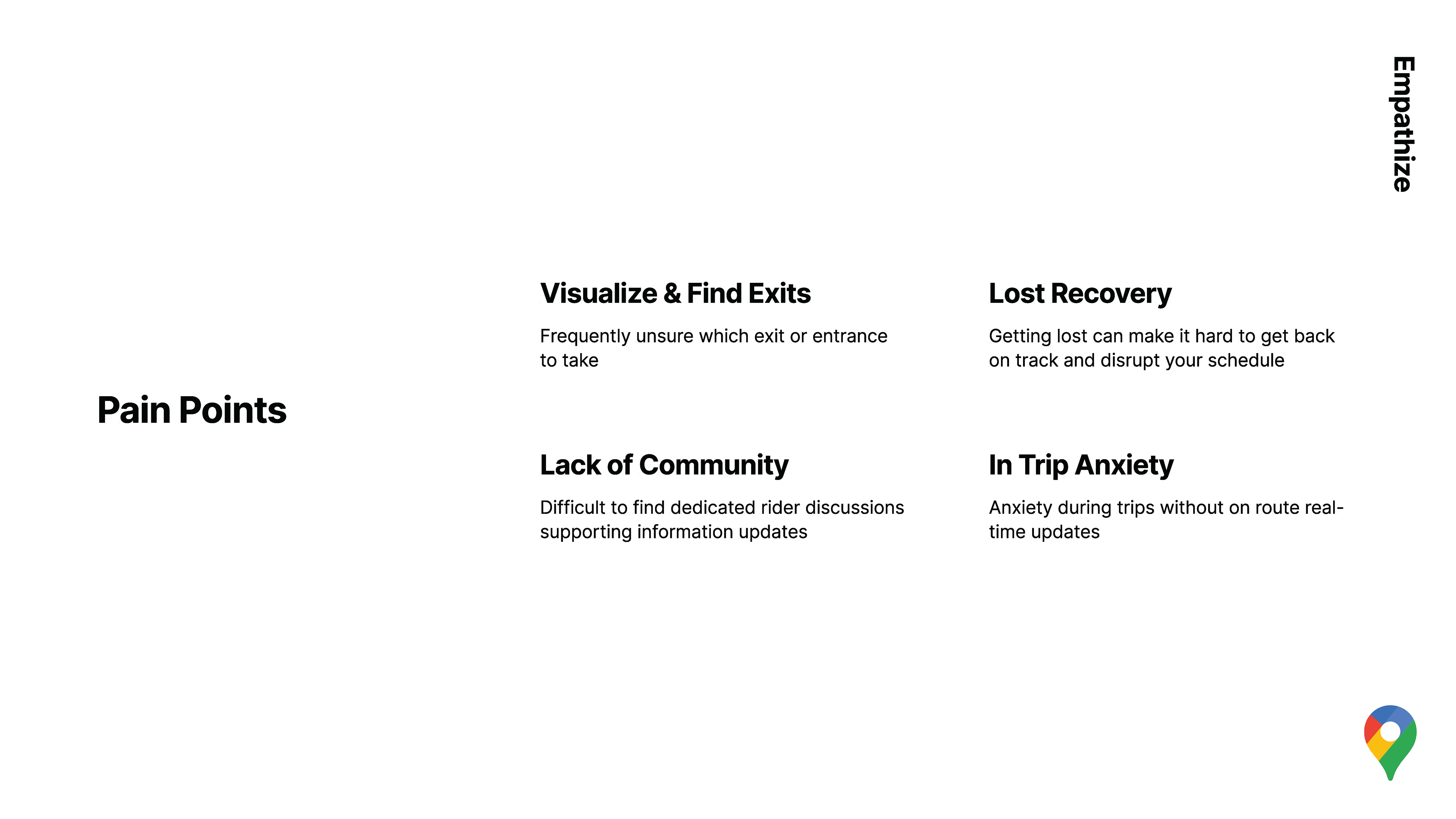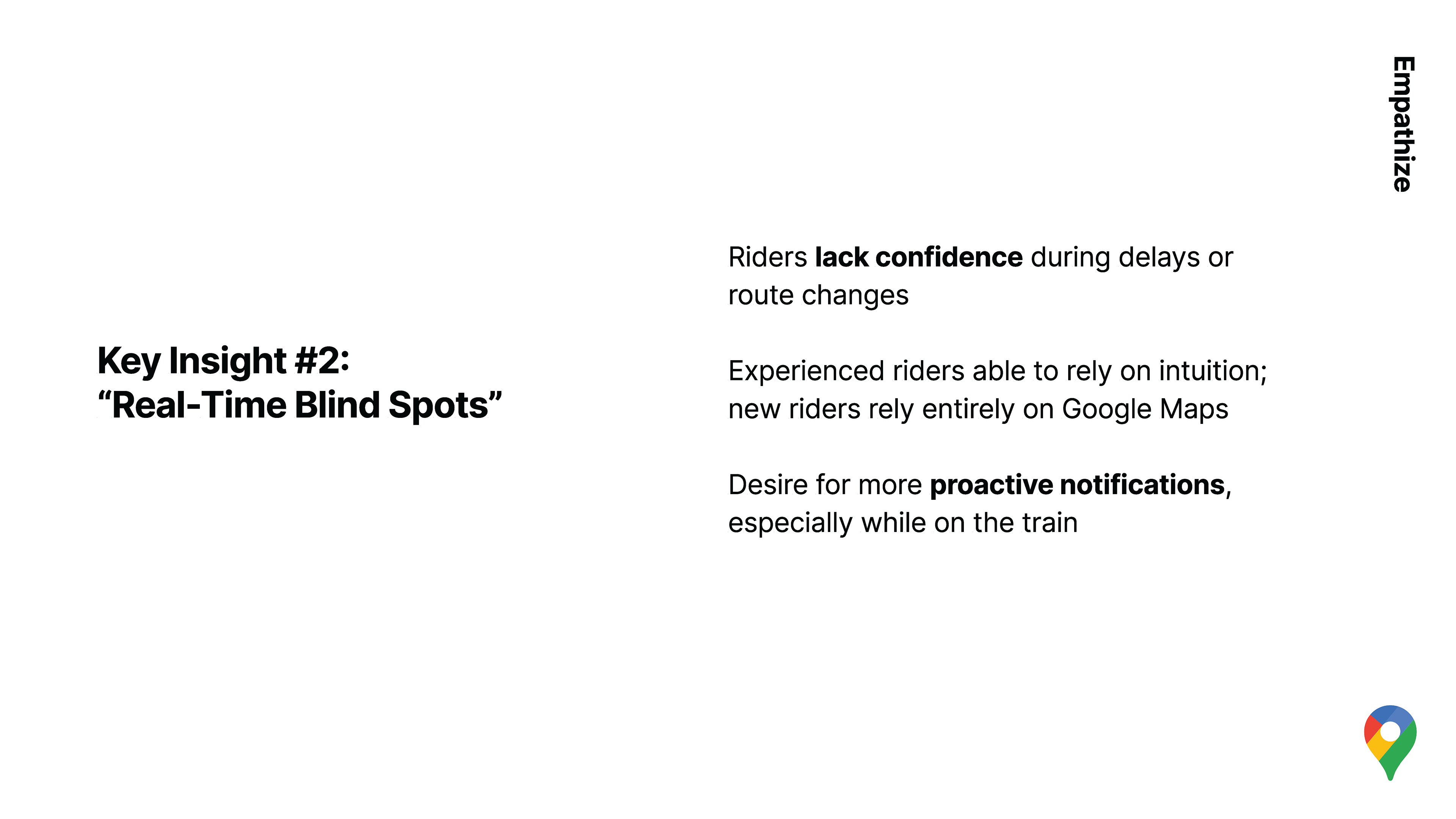 During delays or reroutes, confidence drops sharply. Experienced riders rely on intuition; new riders rely entirely on Google Maps—yet updates often arrive too late or lack context.
