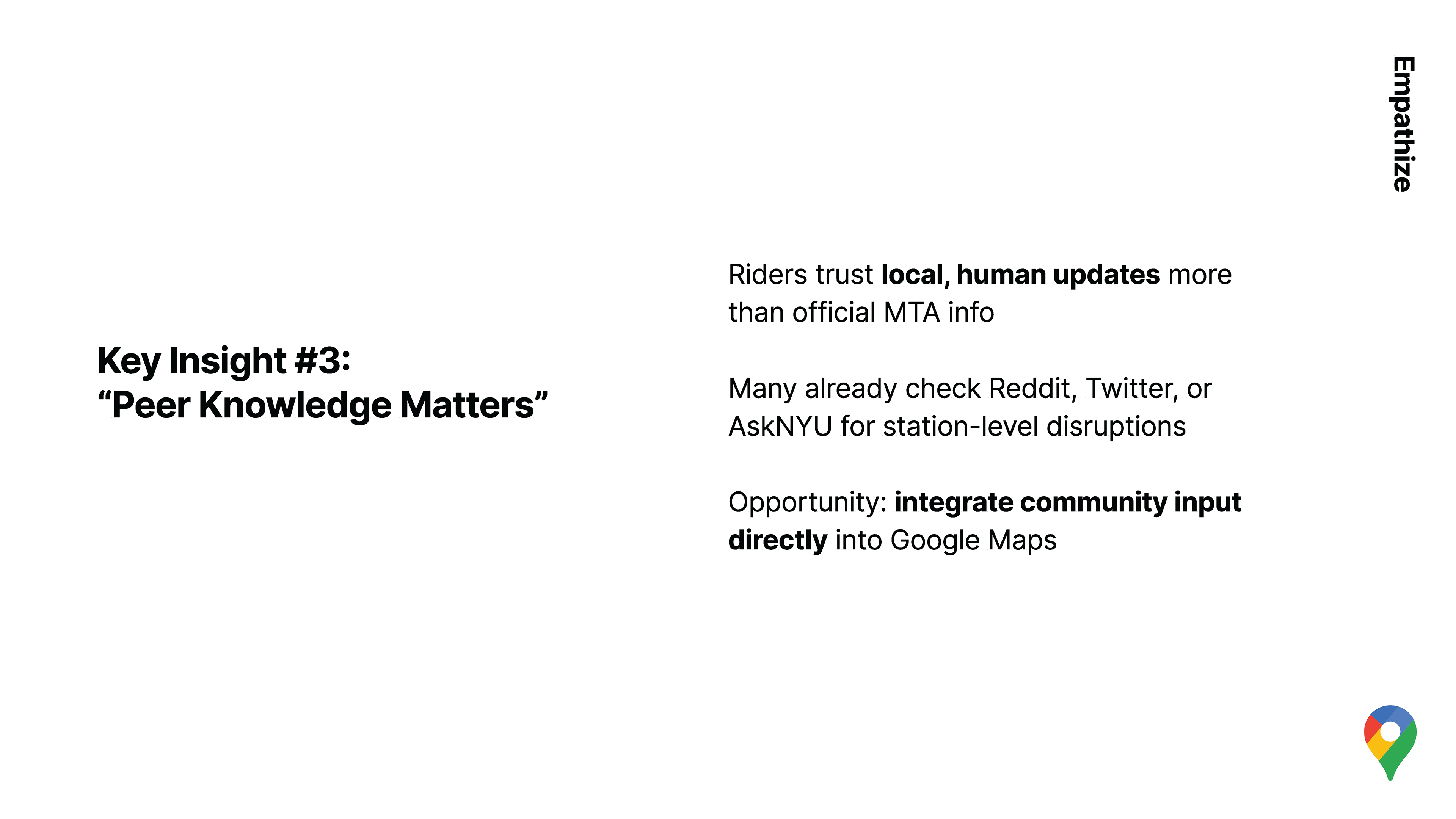 Riders trust local, human updates more than official MTA information. Many already check Reddit, Twitter, or AskNYU for station-specific disruptions.