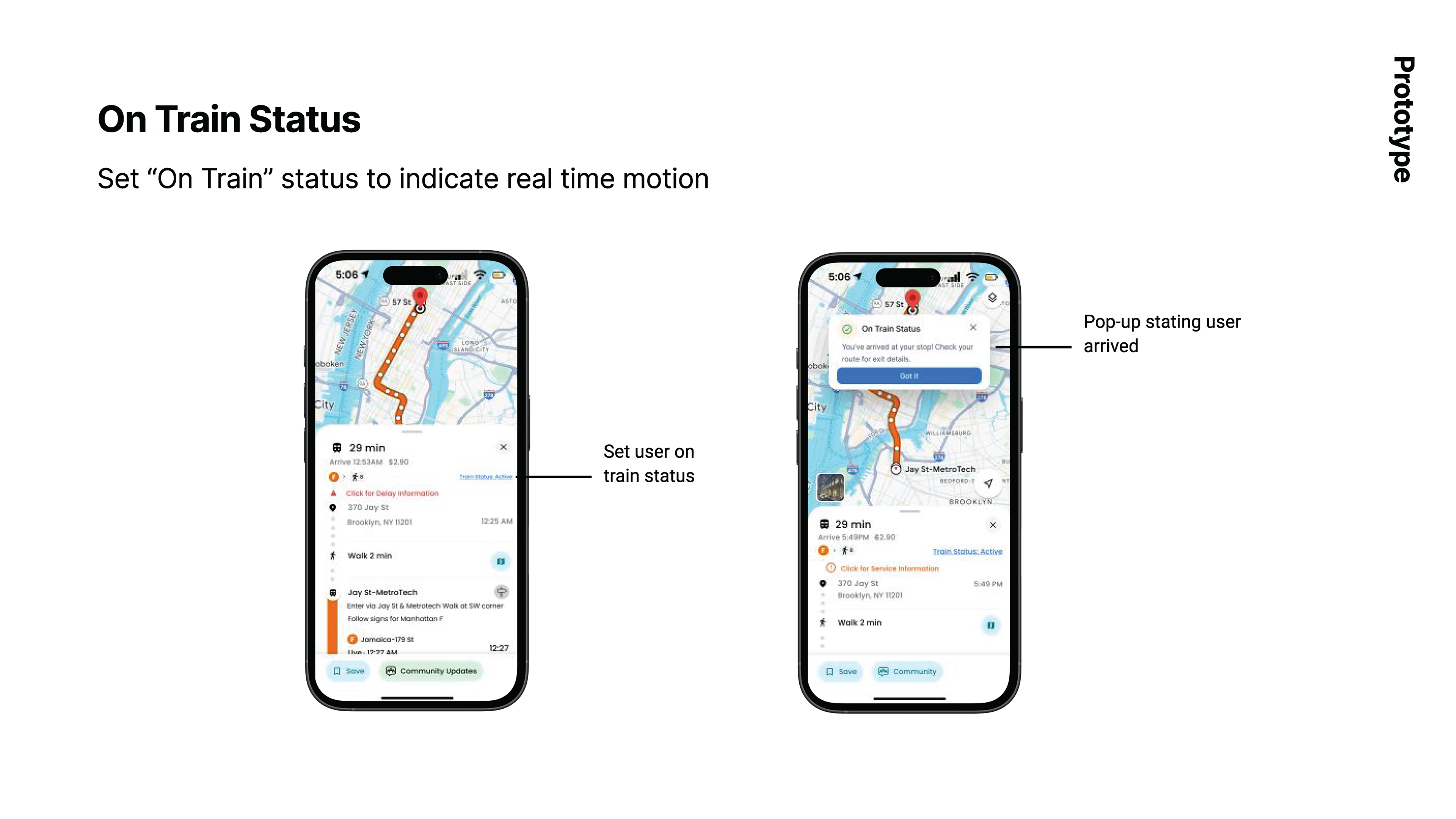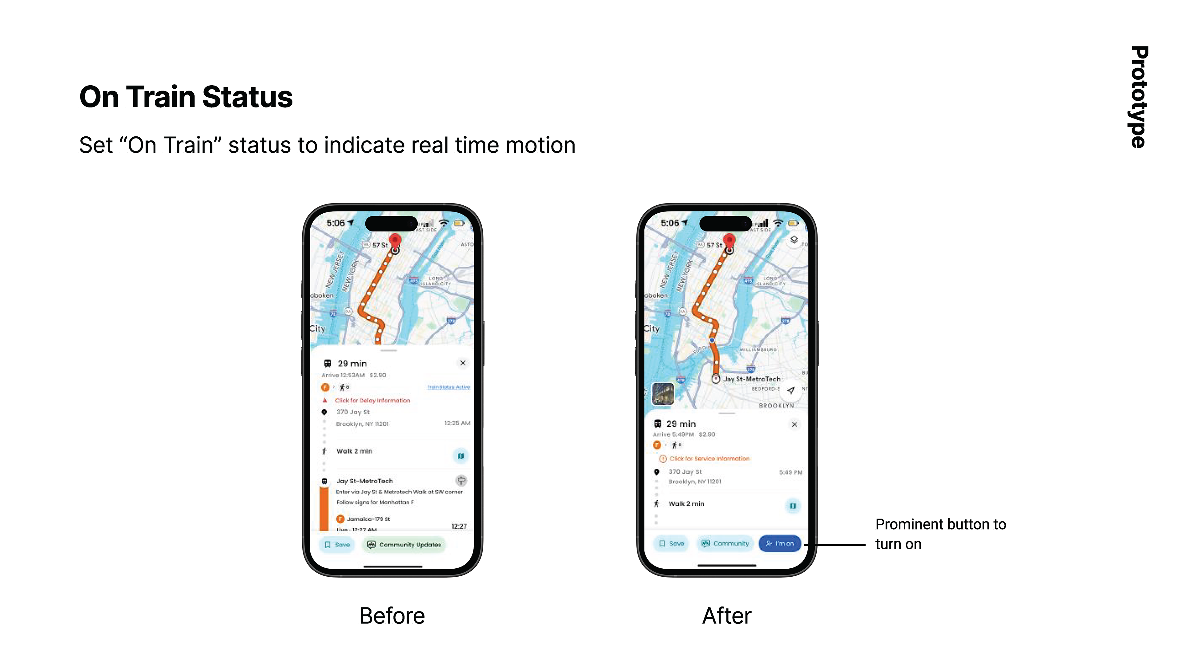 Shift the interaction model from an “On Train” activation to a “Not on Train” override, minimizing user effort during high-attention moments and aligning with real-world rider behaviour.